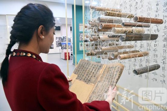 3月14日,敦煌研究院敦煌文獻(xiàn)研究所所長(zhǎng)趙曉星接受中新社記者專訪介紹稱,全彩印《敦煌文獻(xiàn)全集》出版工作已正式啟動(dòng),該叢書采用全彩印的方式刊布敦煌文獻(xiàn),實(shí)現(xiàn)敦煌文獻(xiàn)在線下圖錄中的高清還原。敦煌文獻(xiàn),又稱敦煌遺書,是指1900年在甘肅敦煌莫高窟藏經(jīng)洞發(fā)現(xiàn)的公元4世紀(jì)至11世紀(jì)的寫本、印本和拓片等文獻(xiàn)。據(jù)最新統(tǒng)計(jì)顯示,其總數(shù)近7萬件。目前這些文獻(xiàn)分藏于中、英、法、俄、日等國(guó)的數(shù)十家收藏機(jī)構(gòu),一直缺乏完整的聯(lián)合目錄。圖為3月3日,工作人員在敦煌藝術(shù)館卷軸墻前閱覽敦煌遺書影印品。 中新社記者 九美旦增 攝