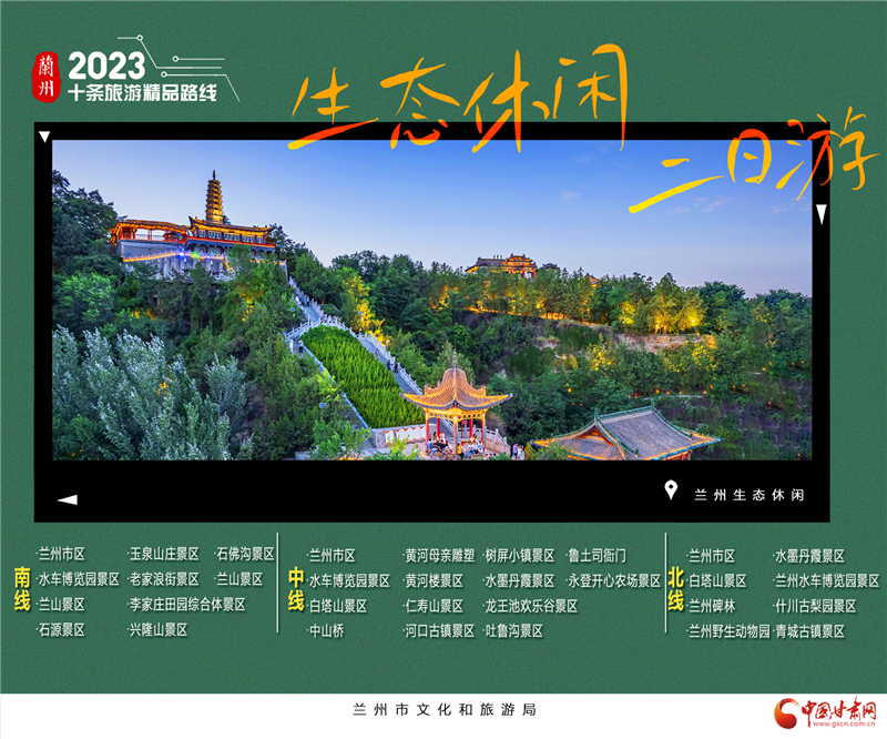 3.蘭州生態(tài)休閑2日游。這里有蘭山景區(qū),泡一壺茗茶覽金城夜景;這里有玉泉山莊,約三兩摯友慢品農(nóng)家風(fēng)味;這里有李家莊田園綜合體,瓜田李下享天倫之樂;或者直接遁入興隆山,隱入深山自逍遙,當半日山居隱士。“蘭州生態(tài)休閑2日游”三條線,分別為南線、中線和北線。