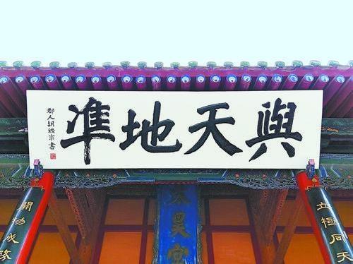 “與天地準(zhǔn)”出自《周易·系辭傳上》。原句為:“易與天地準(zhǔn),故能彌綸天地之道”。準(zhǔn),意為等、等同(此依高亨解)。有學(xué)者或?qū)?ldquo;準(zhǔn)”解釋為標(biāo)準(zhǔn),或解釋為法則等,唯高解最貼原意;彌,意為遍,普遍;綸,意為絡(luò),包絡(luò)。彌綸,意即普遍包絡(luò)。此句可釋為:《易》所闡述的“性命之理”是與天地運(yùn)行的自然法則等同的,所以它能夠包容天地之間萬(wàn)事萬(wàn)物的運(yùn)行規(guī)律。匾文“與天地準(zhǔn)”,是贊頌伏羲首創(chuàng)的八卦,高度概括了天地萬(wàn)物運(yùn)行之規(guī)律,為人們認(rèn)識(shí)世界、改造世界提供了思想武器。