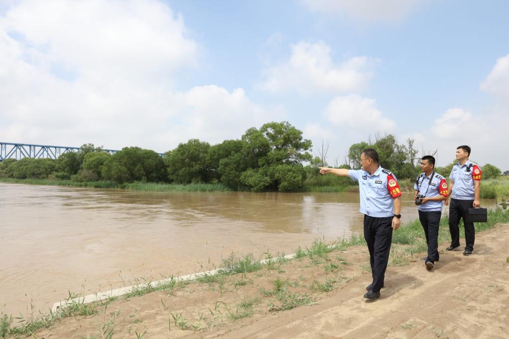 黃河派出所和黃河河務(wù)局水政監(jiān)察大隊(duì)人員對刁口河生態(tài)補(bǔ)水進(jìn)行巡查。新華社記者 劉詩平 攝