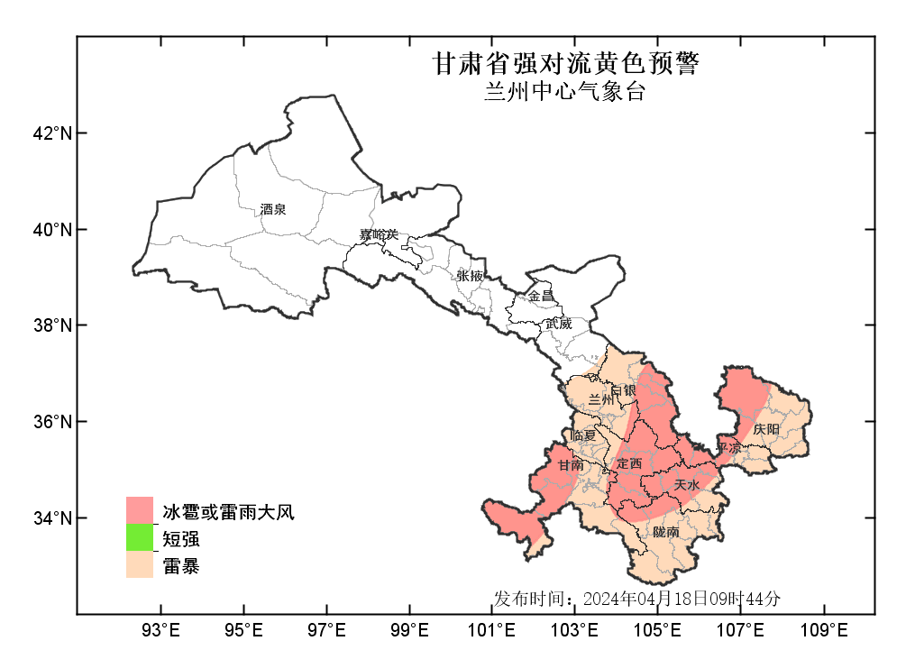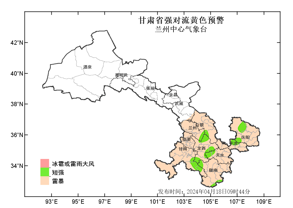 中國(guó)甘肅網(wǎng)4月18日訊(西北角·中國(guó)甘肅網(wǎng)記者 沈文剛)4月18日9時(shí)44分,蘭州中心氣象臺(tái)發(fā)布強(qiáng)對(duì)流黃色預(yù)警:預(yù)計(jì)今天白天到夜間,武威以東大部分地方有雷暴;其中,白銀、定西、甘南、天水等市州部分地方及蘭州、隴南、平?jīng)?、慶陽(yáng)等市局部地方有雷雨大風(fēng)或冰雹;甘南、隴南、定西、天水、白銀、蘭州、平?jīng)?、慶陽(yáng)等州市局部地方有短時(shí)強(qiáng)降水,最大小時(shí)雨強(qiáng)為20-30毫米。