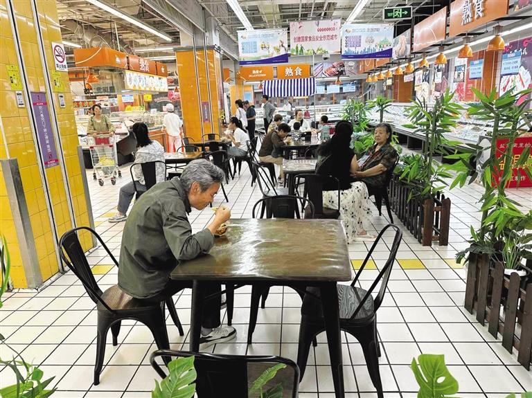 超市里的“平價(jià)食堂”,成為打造一刻鐘便民生活圈的重要載體。“超市周邊的居民、上班族、學(xué)生、酒店差旅客群的基礎(chǔ)比較大,所以增加快餐、堂食也是超市的一項(xiàng)便民舉措。”超市里升騰起的煙火氣,也讓超市的來(lái)客率明顯提升,“周末時(shí),油條的銷量能達(dá)到1000根、豆腐腦能賣到500碗,不管是檔口、自助收銀機(jī)都有排隊(duì)的顧客。”