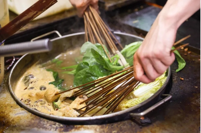 游客挑選好麻辣燙菜品后排隊(duì)等待加工。新華社記者范培珅攝