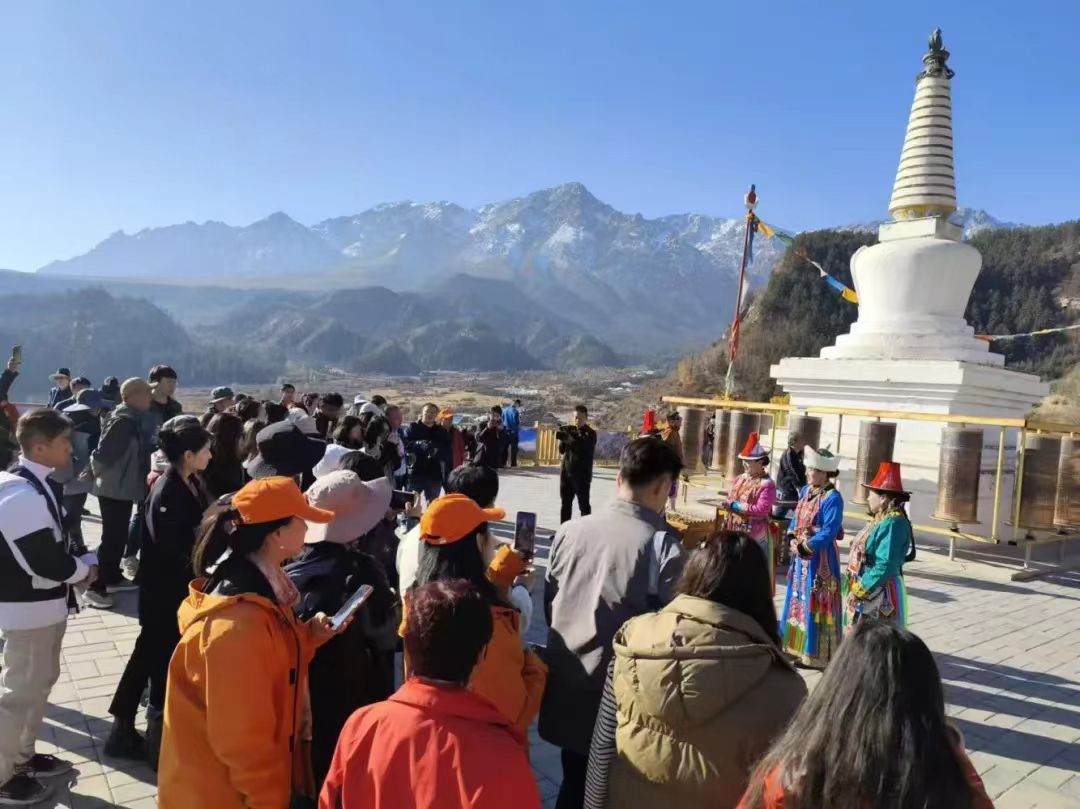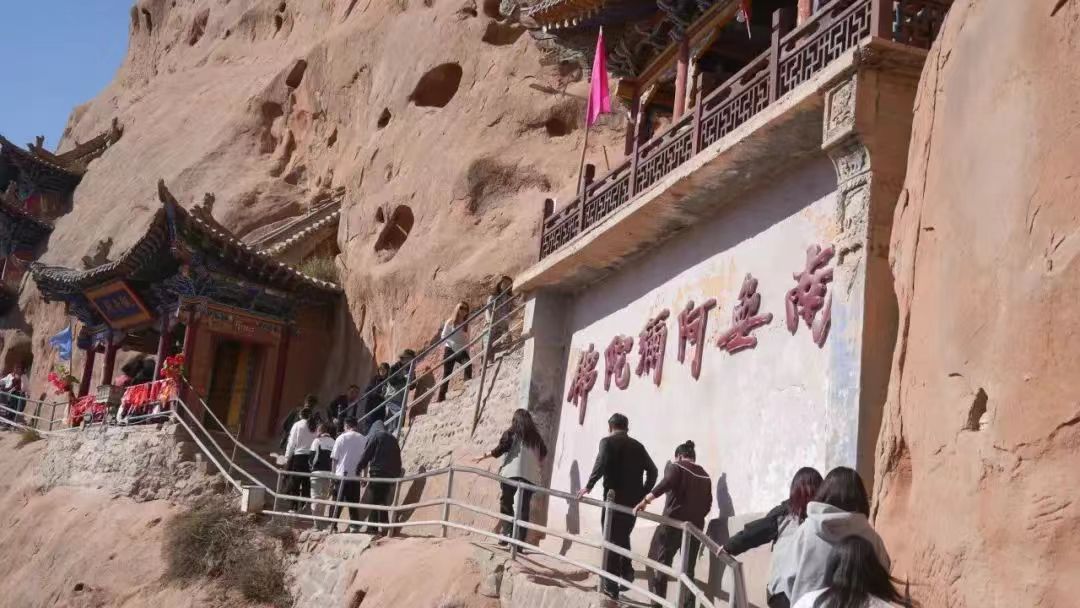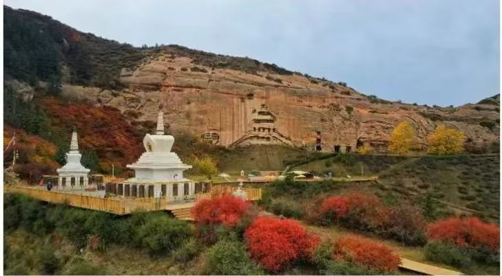 18日上午,迎著耀眼的晨光,采訪團(tuán)成員乘坐大巴車來(lái)到了集自然風(fēng)光、石窟藝術(shù)、民族風(fēng)情、宗教文化于一體的肅南馬蹄寺。馬蹄寺是河西走廊著名的佛教勝地,石窟群開(kāi)鑿于十六國(guó)北涼時(shí)期,距今約1600年的歷史,是絲綢之路上至關(guān)重要的歷史文化瑰寶,也是我國(guó)早期石窟的杰出代表。秋日的馬蹄寺,秋高氣爽,景色宜人,遠(yuǎn)遠(yuǎn)看去,紅綠相間,層林盡染,大家行走在落葉飄零的山間小路上,對(duì)這座建在懸崖峭壁之上、將棧道鑲嵌在山體之內(nèi)的石窟充滿了好奇。
