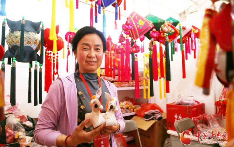 在展館的一角,來自慶城的一位香包繡制商戶喬志梅正在現(xiàn)場(chǎng)推銷著自己帶來的產(chǎn)品。其中驢形香包最為顯眼,據(jù)她介紹,驢形香包多數(shù)呈現(xiàn)黑色,有忠厚、老實(shí)之寓意,在當(dāng)?shù)貥O受喜愛。但她制作的驢形香包,通體為白色,鬃毛為粉色,驢耳一上一下較為可愛俏皮。