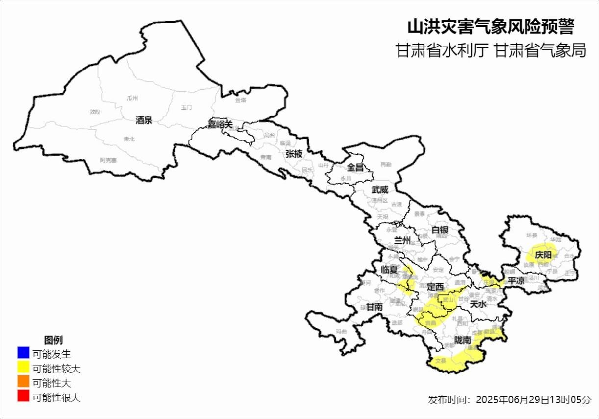 根據(jù)省氣象局《重大氣象信息專報(bào)》(2025年甘氣第10期),未來(lái)十天甘肅省多降水天氣,具有對(duì)流性強(qiáng)、小時(shí)雨強(qiáng)大、累積雨量大等特點(diǎn),洪水災(zāi)害風(fēng)險(xiǎn)高。6月29日13時(shí),省水利廳、省氣象局聯(lián)合發(fā)布山洪災(zāi)害氣象風(fēng)險(xiǎn)預(yù)警:預(yù)計(jì),6月29日14時(shí)至30日14時(shí),白銀市(景泰縣),武威市(古浪縣),定西市(臨洮縣、渭源縣、通渭縣、隴西縣、漳縣、岷縣),臨夏州(廣河縣、東鄉(xiāng)縣、康樂(lè)縣),甘南州(臨潭縣、卓尼縣、舟曲縣、迭部縣),天水市(秦安縣、甘谷縣、武山縣、張家川縣),隴南市(宕縣、禮縣、武都區(qū)、成縣、文縣、康縣、徽縣、兩當(dāng)縣),平?jīng)鍪校o寧縣、崆峒區(qū)、華亭市、莊浪縣),慶陽(yáng)市(西峰區(qū)、慶城縣、環(huán)縣、華池縣、鎮(zhèn)原縣)等地區(qū)發(fā)生山洪災(zāi)害可能性較大(黃色預(yù)警)。