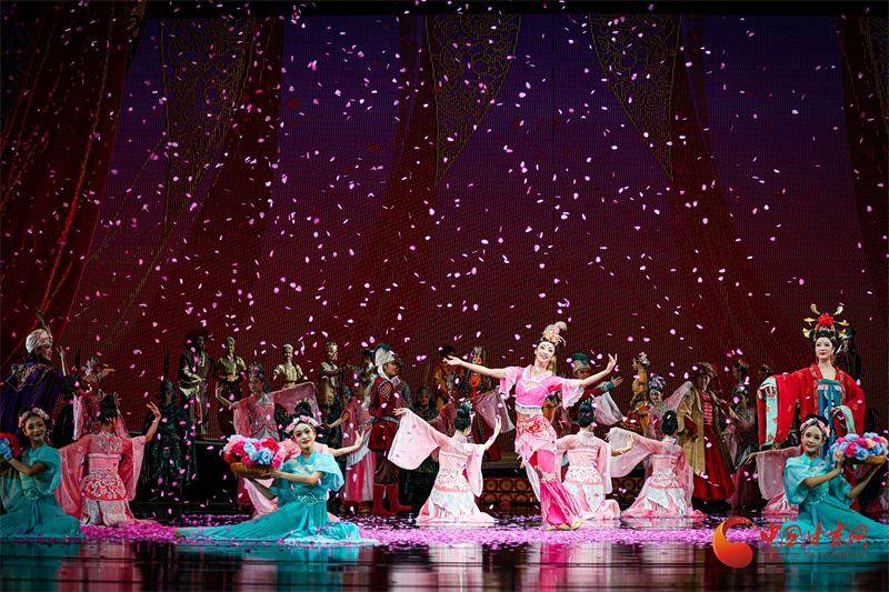 當(dāng)全息投影將莫高窟壁畫在舞臺上緩緩展開,當(dāng)駝鈴聲與電子樂編曲交織出跨越時空的和弦,觀眾相信,所謂“傳統(tǒng)”從不是凝固的標(biāo)本,而是流動的生命,正如劇中穿越千年的花雨,落在古代畫工的筆端,落在當(dāng)代舞者的袖間,浸潤海內(nèi)外每一位觀演者的心田。劇中描繪的中外友好通商、民心交融場景,更是對新時代“一帶一路”倡議的生動詮釋。(甘肅省文化旅游廳供圖)