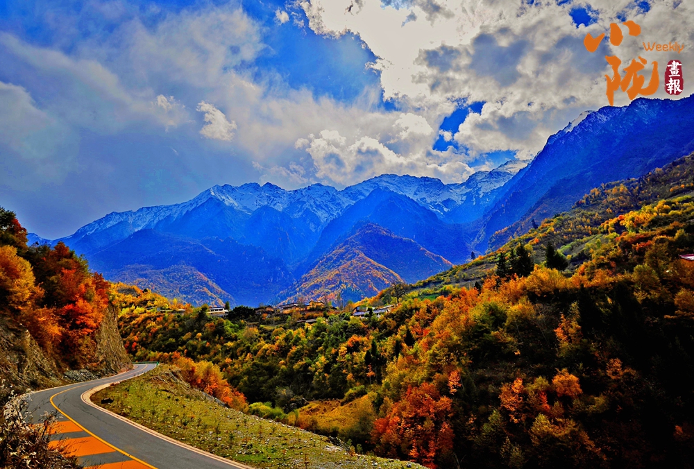 山巔的白雪與彩林形成鮮明對比,紅與黃,白與藍,在陽光的映照下,共同編織出一幅溫柔而夢幻的畫卷。