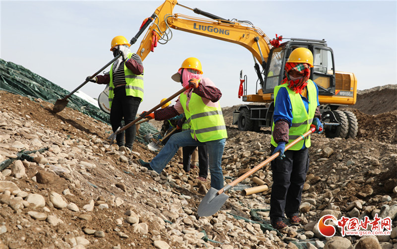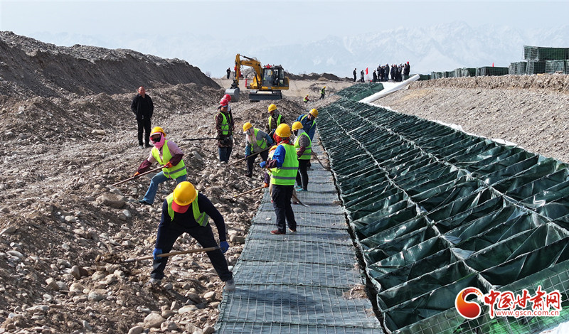 3月23日,在民樂(lè)縣大堵麻河防洪治理工程項(xiàng)目施工現(xiàn)場(chǎng),工人們正在緊張有序的修筑河堤。