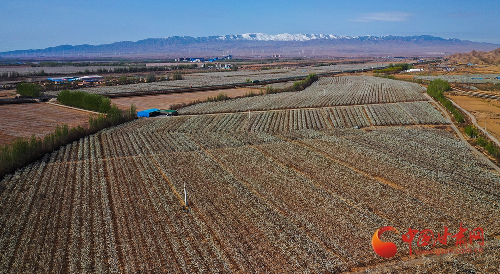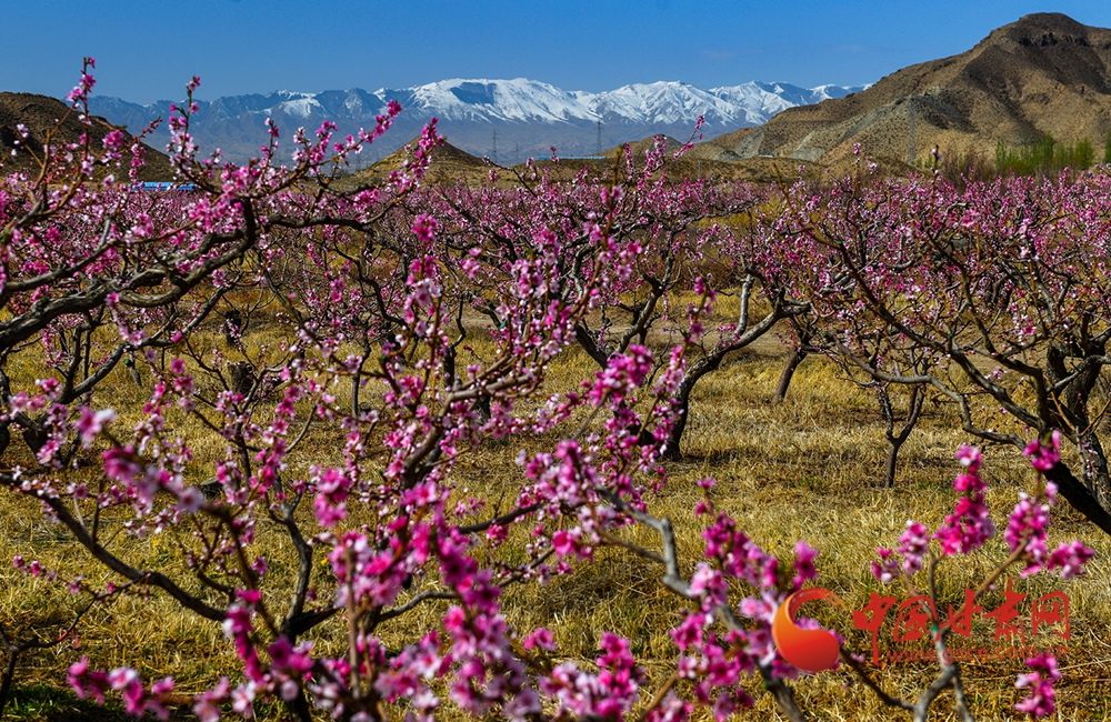 谷雨即將到來,景泰縣獵虎山村境內(nèi)的數(shù)百畝桃園花開正紅,比鄰的條山農(nóng)場萬畝梨園梨花正白。目光掠過桃園、梨園,遠眺西南方的祁連山東端余脈壽鹿山,皚皚白雪覆蓋山頂,青色的山巒環(huán)繞四周,三者同框猶如一場視覺盛宴,令人沉醉。