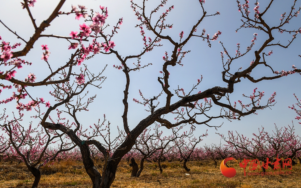 虬枝橫斜綴粉花,桃林漫野顯生機