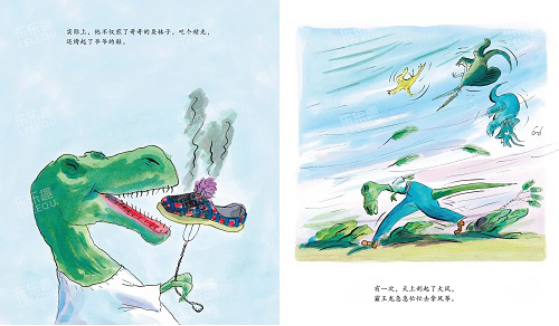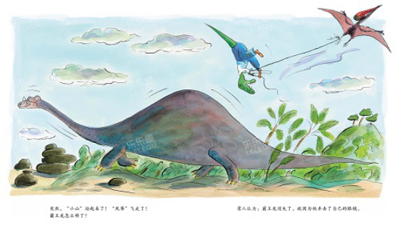 一只可憐的霸王龍弄丟了自己的眼鏡。沒有眼鏡,他分不清馬桶和洗臉盆;沒有眼鏡,他分不清咸魚和臭襪子……直到一個(gè)大風(fēng)天,霸王龍拉著一個(gè)“風(fēng)箏”吃力地爬上了一座“小山”,突然,“小山”站起來了,“風(fēng)箏”拉著他飛走了。霸王龍會(huì)遇到危險(xiǎn)嗎?他能平安地回來嗎?