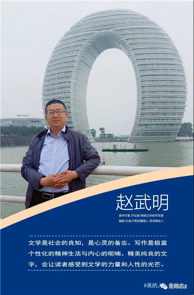 懷瑾握瑜,勤耕不輟。趙武明的寫作是安靜的,由于從事20余年的新聞工作,給他貯存了很多素材,所以他涉獵的寫作范疇很廣,寫散文隨筆、文藝評論、紀錄片、微電影、大型晚會總撰稿,還研究網(wǎng)絡(luò)文學(xué)。如果說文字是會呼吸的,趙武明的文字除了唯美,更多的是硬骨錚錚,也不乏柔腸的峻厲和倬約,風(fēng)姿獨具,淡雅濃烈,相得益彰,簡約獨立,一語千里,蘊含張力。他常說,寫作要穿透人心抵達靈魂。向外,不斷追求生命更高的境界;向內(nèi),不斷觸及心靈。