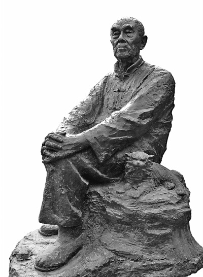 這尊坐像中,季羨林先生靜靜地坐在石頭上,雙手抱膝,目視遠方,身旁臥著一只他喜愛的小貓。選自《紀峰雕塑札記》