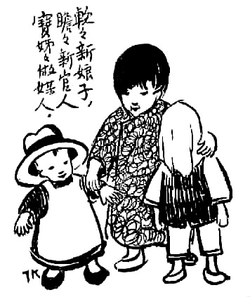子愷先生藝術(shù)之獨(dú)特在另一方面——獨(dú)樹高標(biāo),表現(xiàn)童心童趣,抒情融入詼諧,展示了一種美學(xué)境界。此類經(jīng)典之作大多收集于《兒童相》。令人過目不忘者如畫孩子持兩蒲扇,一前一后,作騎馬狀,題曰“瞻瞻的腳踏車”;孩子將自己的鞋子墊于四腳圓凳之下,題曰“阿寶兩只腳,凳子四只腳”。于兒童經(jīng)驗(yàn)之局限寫其心靈之天真,于不起眼的、平常人視之無所謂的現(xiàn)象中發(fā)現(xiàn)童心之美。還有一幅令人印象深刻,三個孩子,一女稍高,立于中,左側(cè)男孩,戴英式禮帽,甚大,右側(cè)女孩,頭蒙面布,題曰“軟軟新娘子,瞻瞻新官人,寶姊姊做媒人”。其事極不現(xiàn)實(shí)而孩子極慎重,于兒童顯示童心童趣,于畫則表現(xiàn)了先生的愛心和幽默。