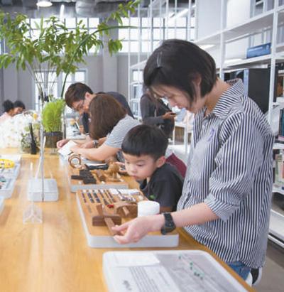 在泰國(guó)創(chuàng)意與設(shè)計(jì)中心圖書館,來訪者正在位于二層的材料體驗(yàn)區(qū)參觀。泰國(guó)創(chuàng)意與設(shè)計(jì)中心圖書館供圖