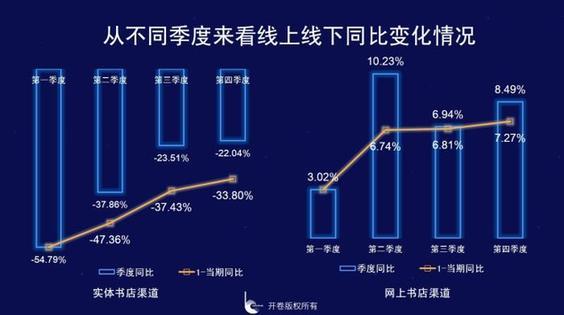 從不同類型書店來看,一二線城市以及超大書城類同比下滑嚴(yán)重,全年同比降幅均在35%以上,從不同季度來看,不同類型書城和整個(gè)實(shí)體店渠道趨勢(shì)變化類似。