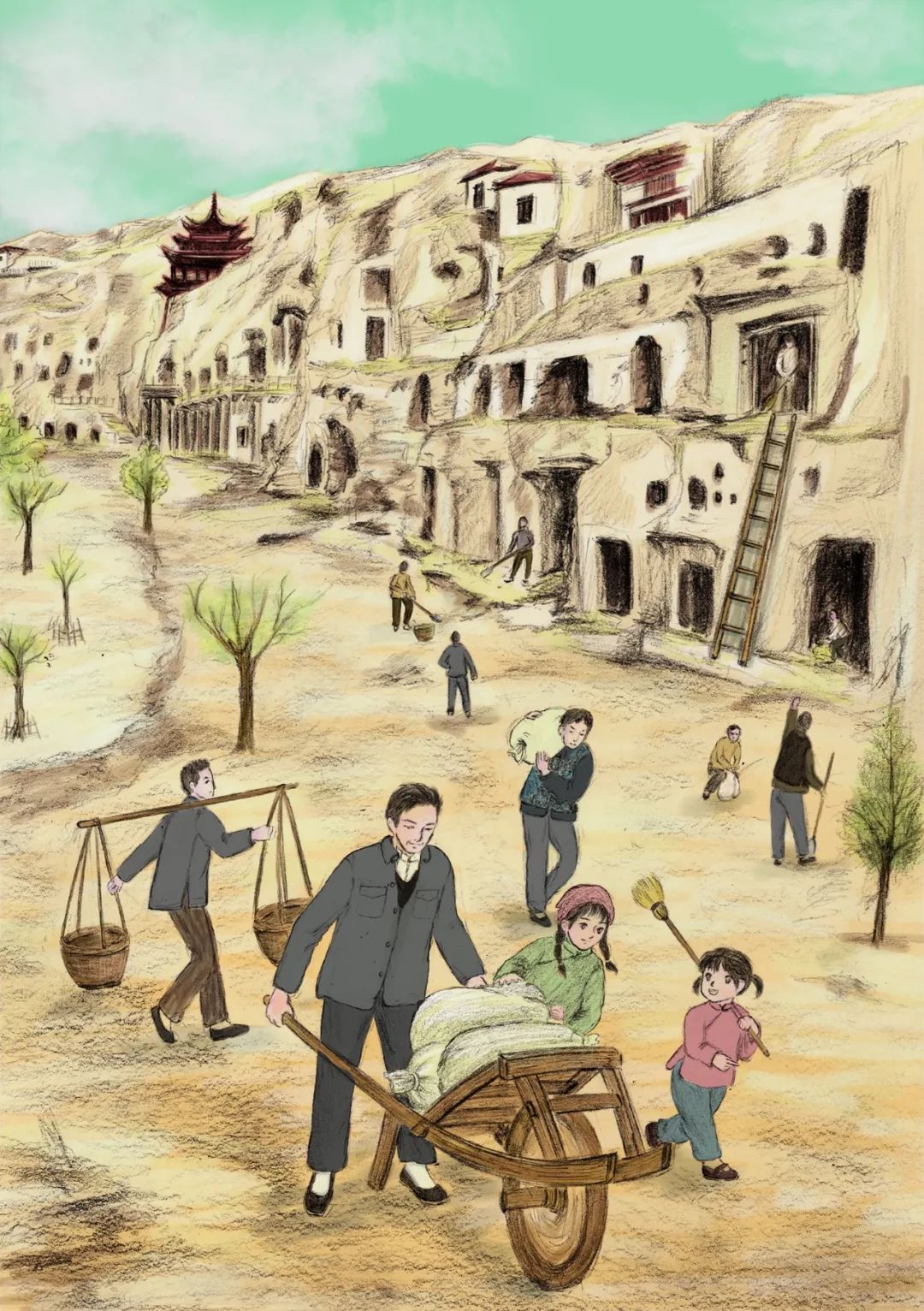 《敦煌小畫師》的故事,以民國時候國立敦煌研究所初創(chuàng)時期為背景,以一個小女孩欣潔的眼光,摹刻了一群以敦煌為文化藝術(shù)圣地而奮斗而獻(xiàn)身的藝術(shù)家和學(xué)者群體,這個群體以欣潔的父親為代表,他們舍棄溫暖濕潤的家鄉(xiāng),而遠(yuǎn)赴那個遙遠(yuǎn)荒涼的所在。因?yàn)槟抢镉卸鼗停驗(yàn)槟抢锉4嬷磺Ф嗄昵暗恼滟F文物和彩塑壁畫,還因?yàn)槟抢锛毙栌腥藖肀Wo(hù)、修復(fù)和弘揚(yáng)。他們來了,他們在這片戈壁之地安家扎根,在動蕩的社會時局下開始了為家為國的擔(dān)當(dāng),也開始了人生理想和價值的實(shí)現(xiàn)。這一切,以一個孩子的眼光來看,幾乎就是交織著欣喜和失望、歡喜與憂愁,從茫然無知到誠摯熱愛的一段生動故事?!抖鼗托‘嫀煛饭适虑楣?jié)的設(shè)定,有起伏有高潮,有親情之愛,有田野之趣,更有人與人之間和諧相助的人性之美,讀起來有聽一首鄉(xiāng)村音樂的韻律感。我覺得,一部優(yōu)秀的兒童文學(xué)作品,應(yīng)該就是這個樣子。