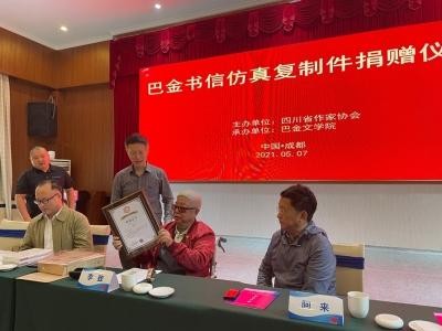 捐贈儀式由四川省作協(xié)黨組書記侯志明主持,省作協(xié)主席阿來致辭。省作家協(xié)會向李致頒發(fā)了收藏證書。詩人黎陽現(xiàn)場朗誦了巴金大哥寫給巴金一封信的選段,內容充滿情感,令人動容。朱丹楓、廖全京等文藝界人士,以及巴金多位親屬出席了捐贈儀式。