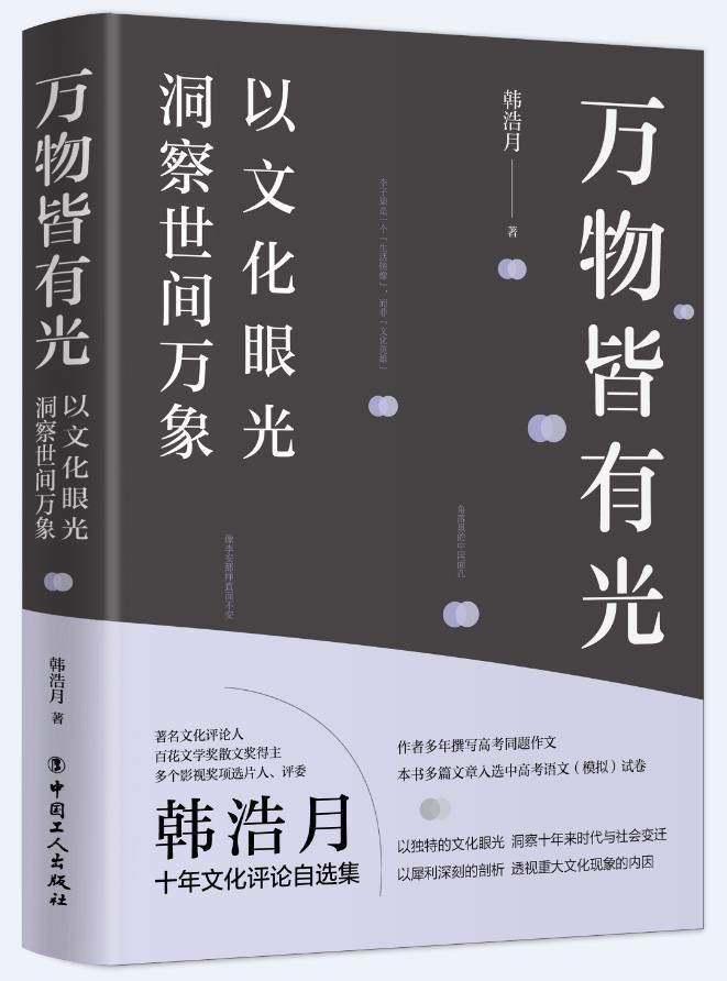 近日,文化評(píng)論人韓浩月新作《萬物皆有光》由中國工人出版社出版。韓浩月深耕于文化領(lǐng)域評(píng)論,對(duì)文化熱點(diǎn)、現(xiàn)象與人物的評(píng)論有自己獨(dú)到的視角與見解。本書是其近十年來發(fā)表于各大媒體的評(píng)論精選集。