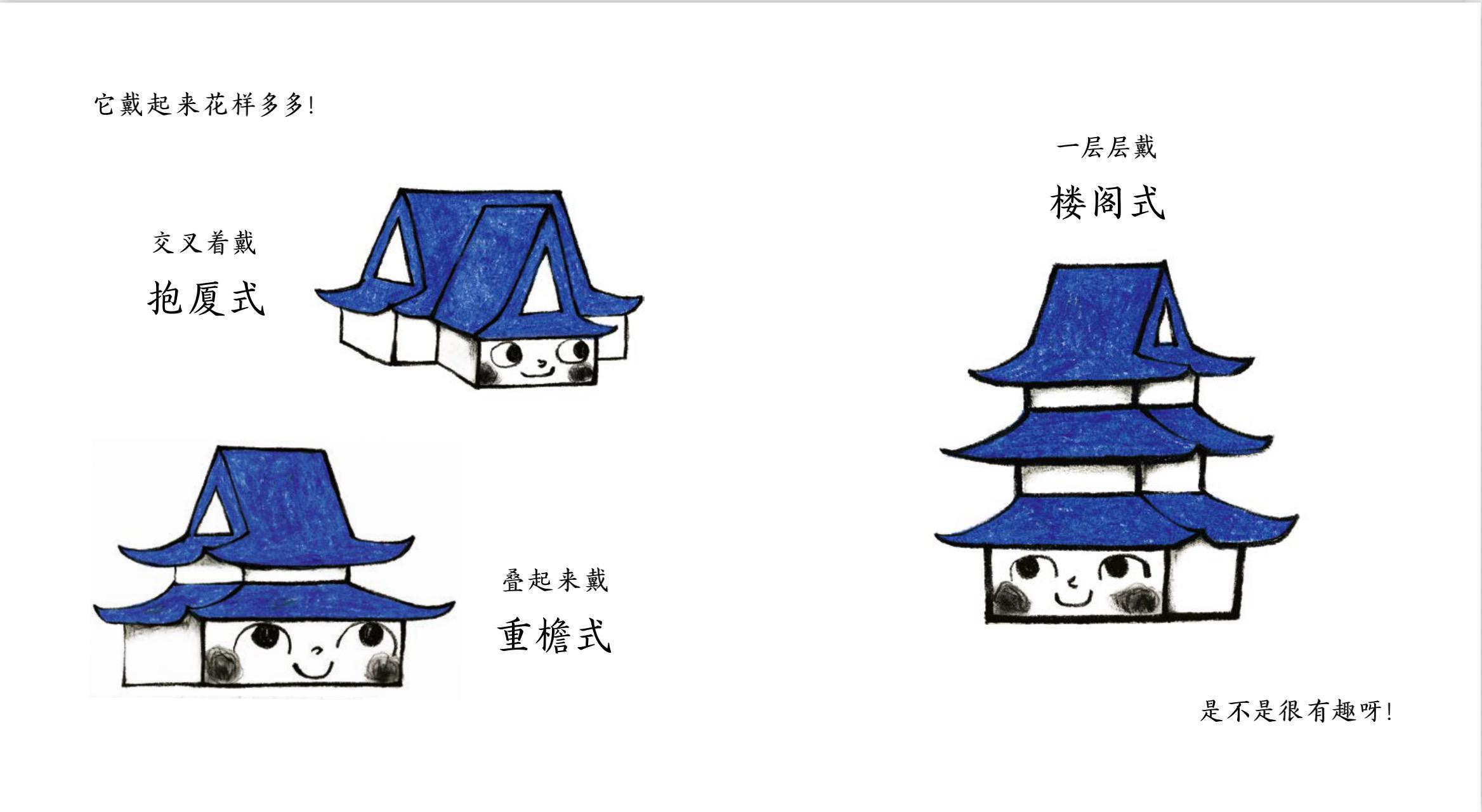 作者以真實(shí)的傳統(tǒng)建筑為原型,選取屋頂、鴟吻、窗欞、斗拱、瓦當(dāng)和柱礎(chǔ)這六個頗有代表性的傳統(tǒng)建筑構(gòu)件,讓他們自由地演繹自己的故事。比如,介紹屋頂時,想象成“給房子戴帽子”,不同的“帽子”有不同的名字,還有不同的戴法: