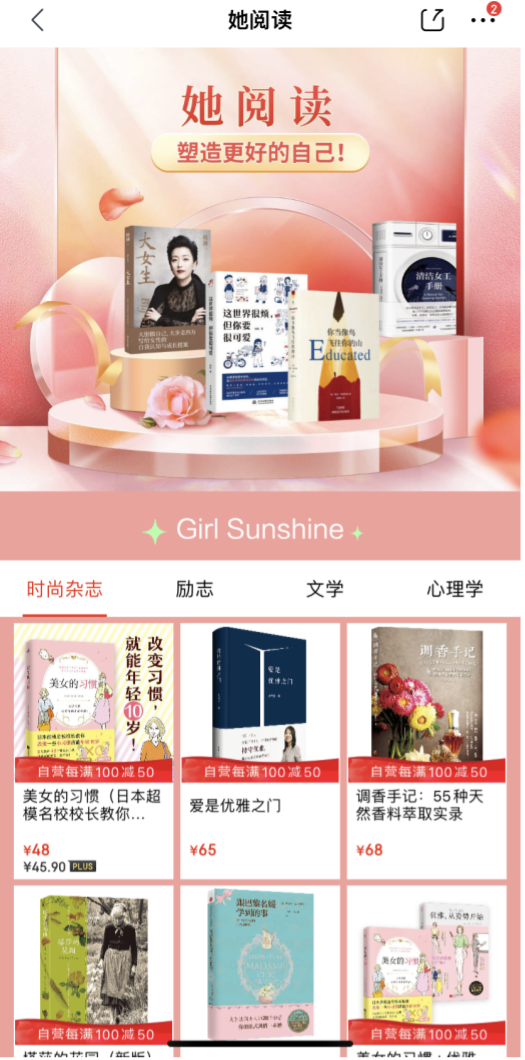 此次京東圖書的“她閱讀”專場,精選了一批女性朋友購買較多的精品圖書。其中, “Girls Sunshine”版塊包括時尚、勵志、文學、心理等類別,使女性讀者通過閱讀滋養(yǎng)內心、塑造更好的自己;“散裝情詩”則聚焦于戀愛、婚姻、兩性話題,從社科、文學、生活等不同類別中甄選相關圖書,便于女性讀者更加清醒、理性地認知和經(jīng)營親密關系;“家庭護航計劃”專為已為人母的女性讀者設置,便于寶媽們?yōu)楹⒆犹暨x優(yōu)質的童書、教輔、課外讀物等,關注女性的同時更惠及下一代的成長;“永遠年輕的次元”則針對女性保持年輕態(tài)及休閑閱讀的需求,提供青春文學、動漫、漫畫、輕小說等內容,打破閱讀的“次元壁”。