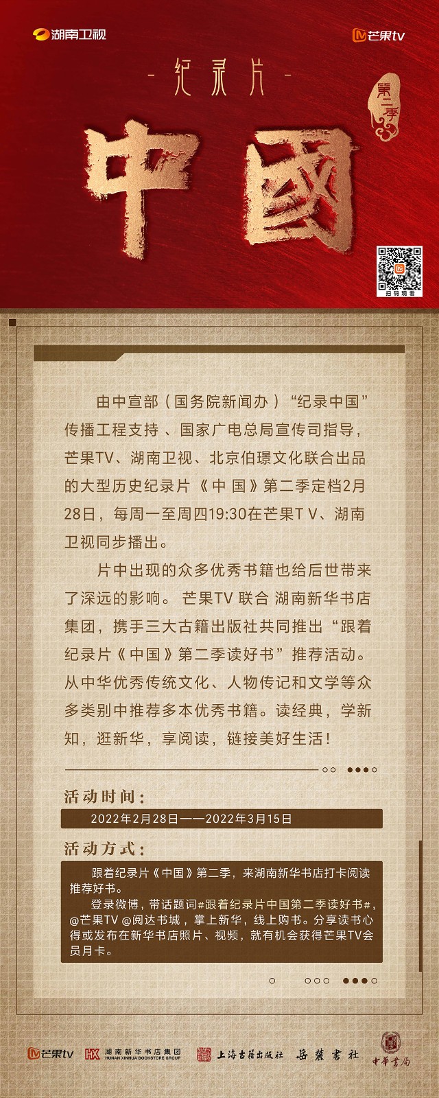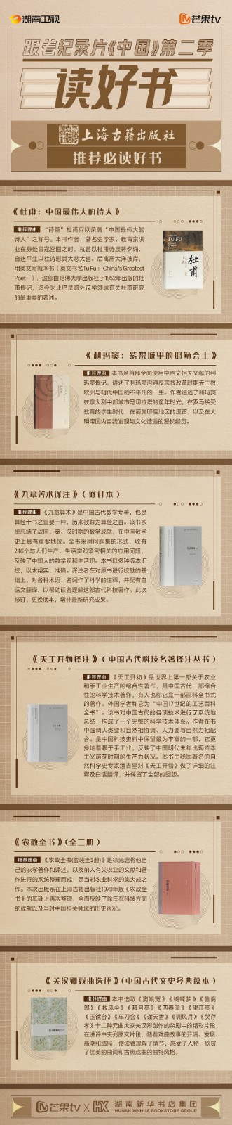 芒果TV以紀(jì)錄片《中國》第二季的精美品質(zhì),聯(lián)合湖南新華書店集團的美譽口碑,將中華書局、上海古籍出版社、岳麓書社推薦的珍品好書,傾情向大眾推薦。本次“跟著紀(jì)錄片《中國》第二季讀好書”活動,將從2月28日持續(xù)到3月15日,湖南新華書店集團旗下湖南圖書城、不吝Boolink書店、全省市級中心門店、長沙地區(qū)樂之書店等全員參與,推薦紀(jì)錄片《中國》第二季。書友及觀眾可登錄微博或到線下門店打卡參與活動。
