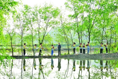 在江西萬載縣馬步鄉(xiāng)洞口村,老師和學(xué)生們?cè)诹鴺湎麻喿x。鄧龍華攝/光明圖片