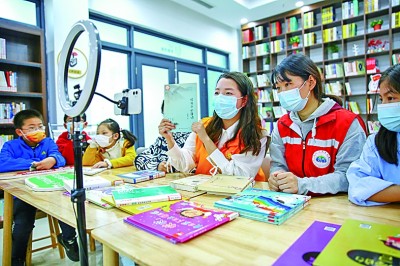 在江蘇如皋市如城街道顧莊社區(qū)農(nóng)家書屋內(nèi),志愿者通過網(wǎng)絡(luò)平臺(tái)為學(xué)生推薦好書。徐慧攝/光明圖片