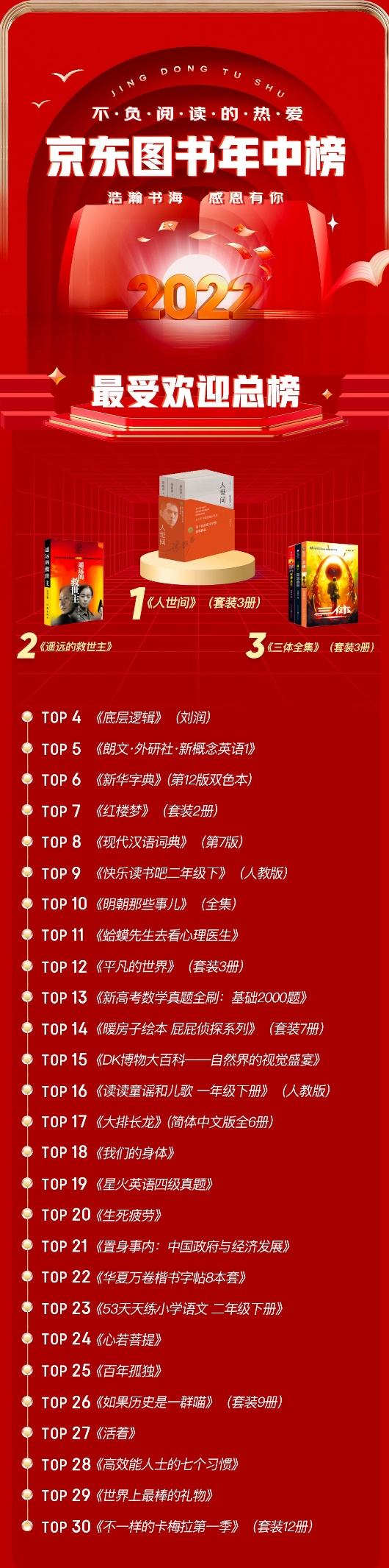 近日,京東圖書發(fā)布了2022年中圖書暢銷榜,包括總榜、新書榜,以及文學(xué)、經(jīng)管、童書、社科、科技、勵(lì)志、生活、藝術(shù)、文教、考試等10個(gè)類別的分榜,每個(gè)榜單均有30種圖書入榜,入榜圖書總數(shù)超過300種。