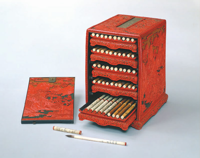 令人稱(chēng)絕的還有乾隆御用的紫檀木旅行文具箱。這是一套箱裝形式的組合文具,按動(dòng)機(jī)關(guān)并將木箱整體翻轉(zhuǎn)過(guò)來(lái),便會(huì)轉(zhuǎn)化為一張高40厘米的書(shū)桌。箱內(nèi)置有布滿(mǎn)層、格、槽的盛物盒,用于盛放各種文房器物,包括琺瑯、漆器、玉器、瓷器等工藝精品,可謂一個(gè)移動(dòng)的書(shū)房。