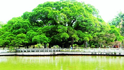 擁有古樹的城市就是擁有歷史的城市。福州古榕遍布,四季常青,是城市、市民生活與樹木的完美結合,是風景的自然生長,是歷史根深葉茂地屹立。福州古榕以樹齡長、歷史久、數量眾而著稱。見證福州城市史的,當首推鼓山國家森林公園、八一水庫旁,福州無人不知的已近千歲,被譽為福州榕樹王的古榕。相傳,這棵古榕是張伯玉所栽植的兩棵樹苖,光陰荏苒,同氣相求,如今兩棵榕樹相互糾結、勾連、纏繞、親密,已無分彼此。其冠幅達1300米,可容納千人在樹下談古論今,聊天遮陰。遠望,似綠色陵巖;近看,知其為榕也,密密的枝葉把近午的陽光切割成碎花點,散落、閃亮在榕樹下的草坪和地衣上。初訪者或為訝異:偌大一棵古榕卻不見氣根,知榕者會告訴你,這是一株碩大、古老而不生氣根的細葉榕。因其冠幅日益長大,為了支撐沉重的樹冠、預防主干折損,便制作了若干石柱,砥柱其間。古榕下有湖塘,錦鯉游泳,不時生出紅色漣漪。旁有一碑,上刻:榕蔭照水波心漾,觀魚猶勝花間行。