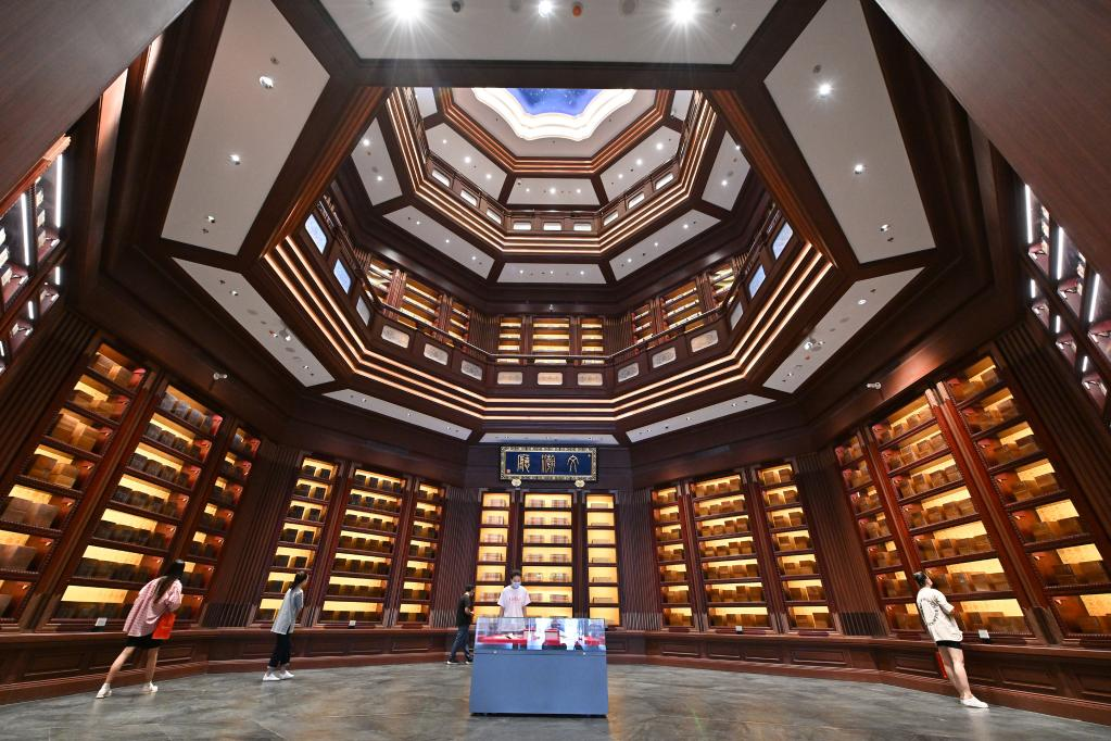 2022年7月30日,觀眾在中國(guó)國(guó)家版本館中央總館文瀚廳內(nèi)參觀。中國(guó)國(guó)家版本館是國(guó)家版本資源總庫(kù)和中華文化種子基因庫(kù),由中央總館文瀚閣、西安分館文濟(jì)閣、杭州分館文潤(rùn)閣、廣州分館文沁閣組成,歷時(shí)三年建設(shè),全面履行國(guó)家版本資源保藏傳承的職責(zé)。