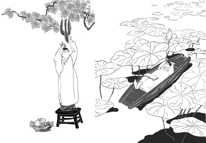 綠葉扶紅花,雅閣、秋雨為這本書(shū)的配圖也頗有特色。隨筆《理想與鄉(xiāng)愁》的封面,是一位戴著眼鏡、長(zhǎng)相酷似作者的文人站在小凳子上,準(zhǔn)備將掛在枝頭的絲瓜摘下來(lái)以供午餐之需,腳旁一只狗狗看守著筐子里的兩個(gè)大水蘿卜。這幅圖與左面的書(shū)名遙相呼應(yīng):作者的“理想”與“鄉(xiāng)愁”就在絲瓜藤下結(jié)為了一體。詩(shī)集《人生歸處是田園》的封面是三株樹(shù)下,那位戴眼鏡的文人坐在長(zhǎng)椅上,望著右面空椅子上的三只小鳥(niǎo),一付若有所思的樣子;而葉廷芳為詩(shī)集所寫(xiě)序言文末的尾花,還是這幅圖,只不過(guò)沿縱軸轉(zhuǎn)動(dòng)180°——文人從右面望向左面。一里一外兩幅畫(huà)互為鏡像,似乎是暗示人們,藝術(shù)就是社會(huì)生活既真實(shí)又不完全一樣的反映。