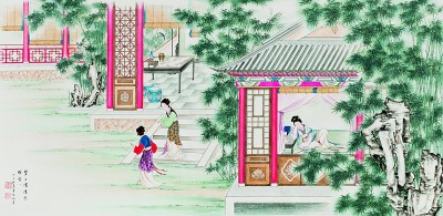 寶玉順腳一徑來到瀟湘館,信步走入,只見鳳尾森森,龍吟細細,悄無人聲。走至窗前,一縷幽香從碧紗窗中暗暗透出。寶玉便將臉貼在紗窗上,往里看時,耳內忽聽得細細的長嘆了一聲道:“每日家情思睡昏昏。”譚鳳嬛繪