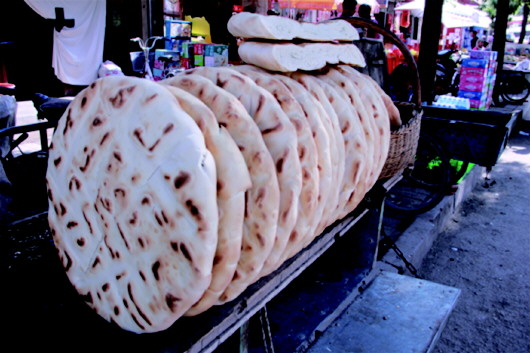 將面粉中加入一定比例的堿水,調(diào)和成面團揉入早發(fā)酵好的面團,然后再添入大量干面,接下來才是關(guān)鍵所在:用堅硬、光滑、沉重的木頭杠子一頭固定(形如杠桿),一頭人工操作,反復(fù)揉壓面團,直到將干面團壓成綢子一樣綿軟,再切成1斤、2斤或3斤的面劑子,搟成圓餅狀,抹上清油,撒上少許鹽和胡椒、苦豆、姜黃等佐料,最后將面餅卷起來,豎立壓制成團,再用木杠搟壓成厚而大的圓餅,并在上面用干凈的梳齒等工具精心旋出花紋圖案,抹少許清油,便可上鏊烘烤。