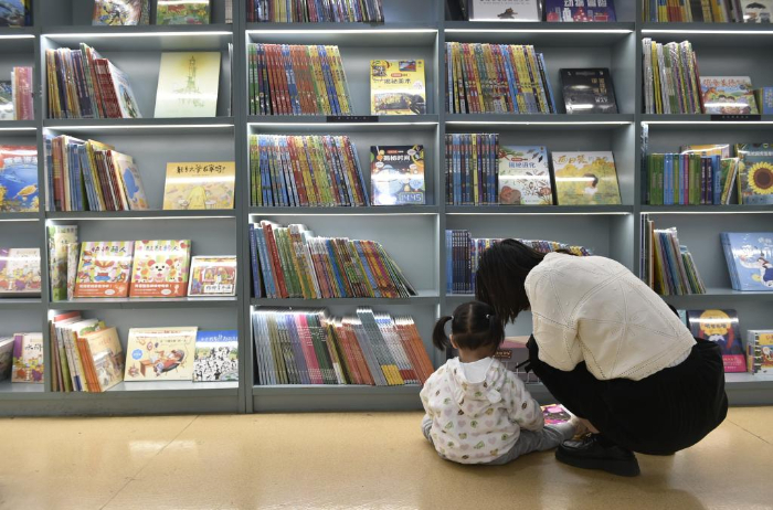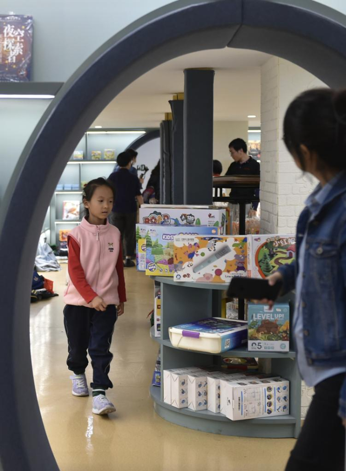 10月18日,家長帶著小朋友在鄭州市緯五路第一小學校園閱讀中心內閱讀。