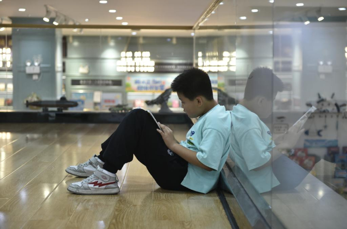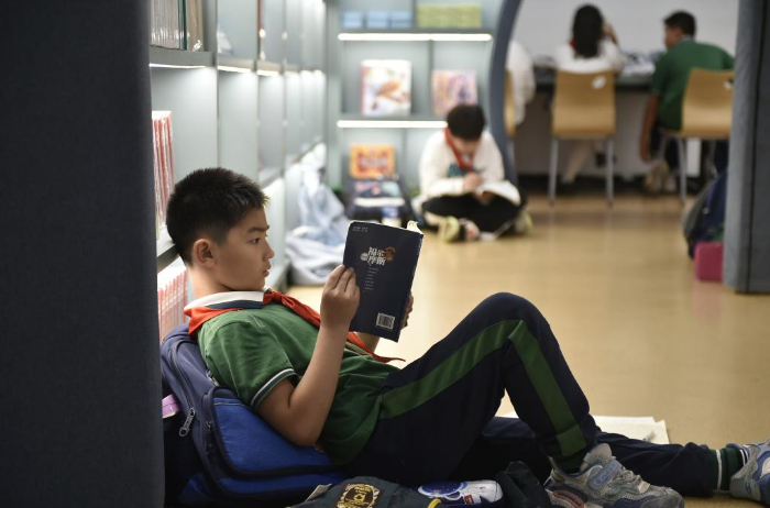 10月18日,一名小學生在鄭州市緯五路第一小學校園閱讀中心內閱讀。