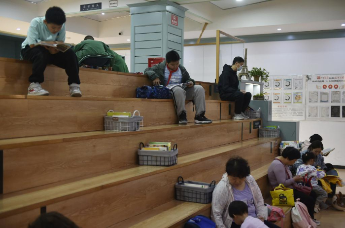 10月18日,小學生在鄭州市緯五路第一小學校園閱讀中心內寫作業(yè)。
