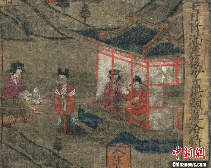 圖為“報父母恩重經(jīng)變絹畫”中的“十月將滿,產(chǎn)后母子俱顯,洗浴時”的畫面。(資料圖)甘肅省博物館供圖