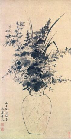 清初畫家王時敏的《端午景圖》《端陽墨花圖》,將艾草、蜀葵、柳條、石榴花等時令花草引入畫中,寄予驅(qū)邪納福的寓意。畫中所寫花草濃墨與淡墨相間,層次分明,體現(xiàn)出駕馭水墨的嫻熟技藝。值得一提的是,《端午景圖》中的瓷瓶為帶冰裂紋的豐肩斂腹瓶,這種將瓷器表面花紋如實(shí)描繪出來的現(xiàn)象,在古代花鳥畫中并不多見,由此可見畫家獨(dú)特的筆墨趣味。