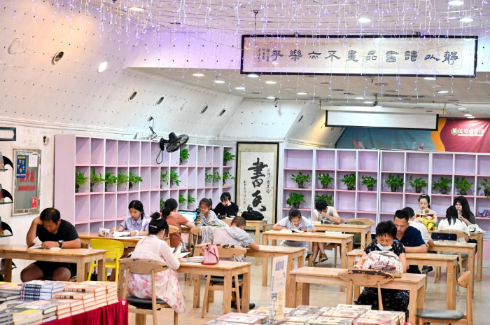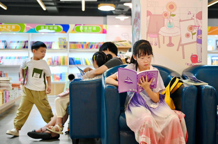 7月6日,小朋友們?cè)诟V菪氯A書(shū)店鰲峰坊書(shū)城內(nèi)讀書(shū)納涼。