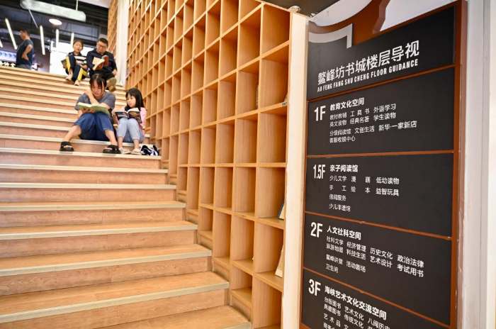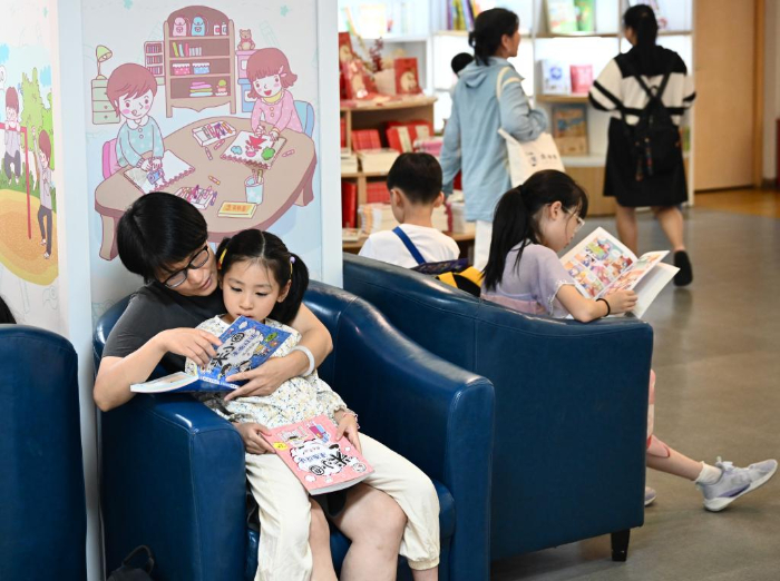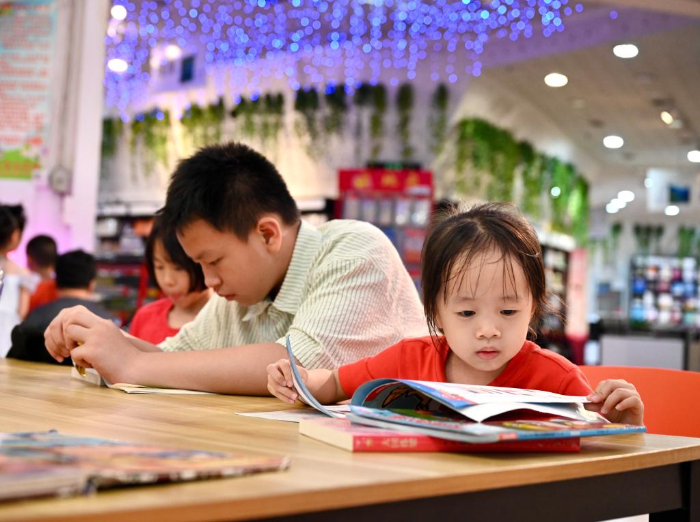 7月6日,福州新華書(shū)店鰲峰坊書(shū)城內(nèi)家長(zhǎng)陪伴孩子讀書(shū)納涼。