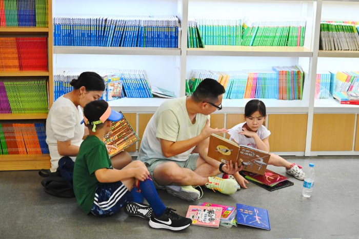 7月6日,小朋友們?cè)诟V菰窖髨D書(shū)城內(nèi)讀書(shū)納涼。