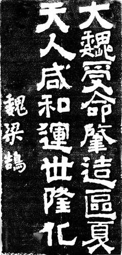 他的書法作品中,具有代表性的是一幅“大魏受命,肇造區(qū)夏,天人咸和,運(yùn)世隆化”的字。這幅字今人能看到拓片。人們評價(jià)說:書跡骨氣凝重,筋力豐足,筆勢雄健,意志戇宕。