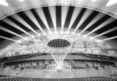 華夏文化展示中心分為展演區(qū)與展示區(qū)兩個部分,展示區(qū)為古鎮(zhèn)式商業(yè)街,目前已進入收尾階段,展演區(qū)為大型激光水舞秀劇場——日月館,去年已試運營,效果極佳。別名“黃河巨蛋”的日月館總用地面積為12000平方米,場館外形呈半橢圓形,由兩片獨立的頂棚覆蓋,場館高30米,寬約80米,內(nèi)設觀眾席位1450座。場館屋頂?shù)奶煅坶_口和場館地面體現(xiàn)了中國天圓地方的理念以及太陽和月亮的互相映襯。外立面采用了與當?shù)貍鹘y(tǒng)屋頂瓦片相呼應的獨特形狀,又像鳥兒折疊的翅膀和羽毛,極富活力和寓意。