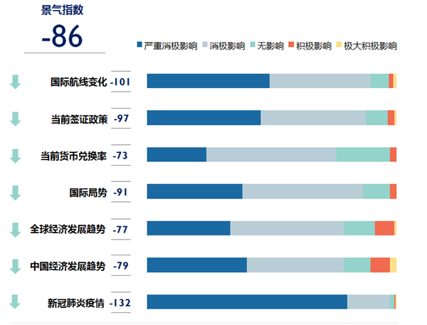 整體而言,從業(yè)者預(yù)期以上7項(xiàng)因素均將對(duì)2020年上半年出境旅游市場(chǎng)業(yè)績(jī)產(chǎn)生負(fù)面影響,導(dǎo)致整體景氣指數(shù)下降至-86。其中,正于全球蔓延的新冠疫情被認(rèn)為是限制出境旅游市場(chǎng)發(fā)展的最主要因素。