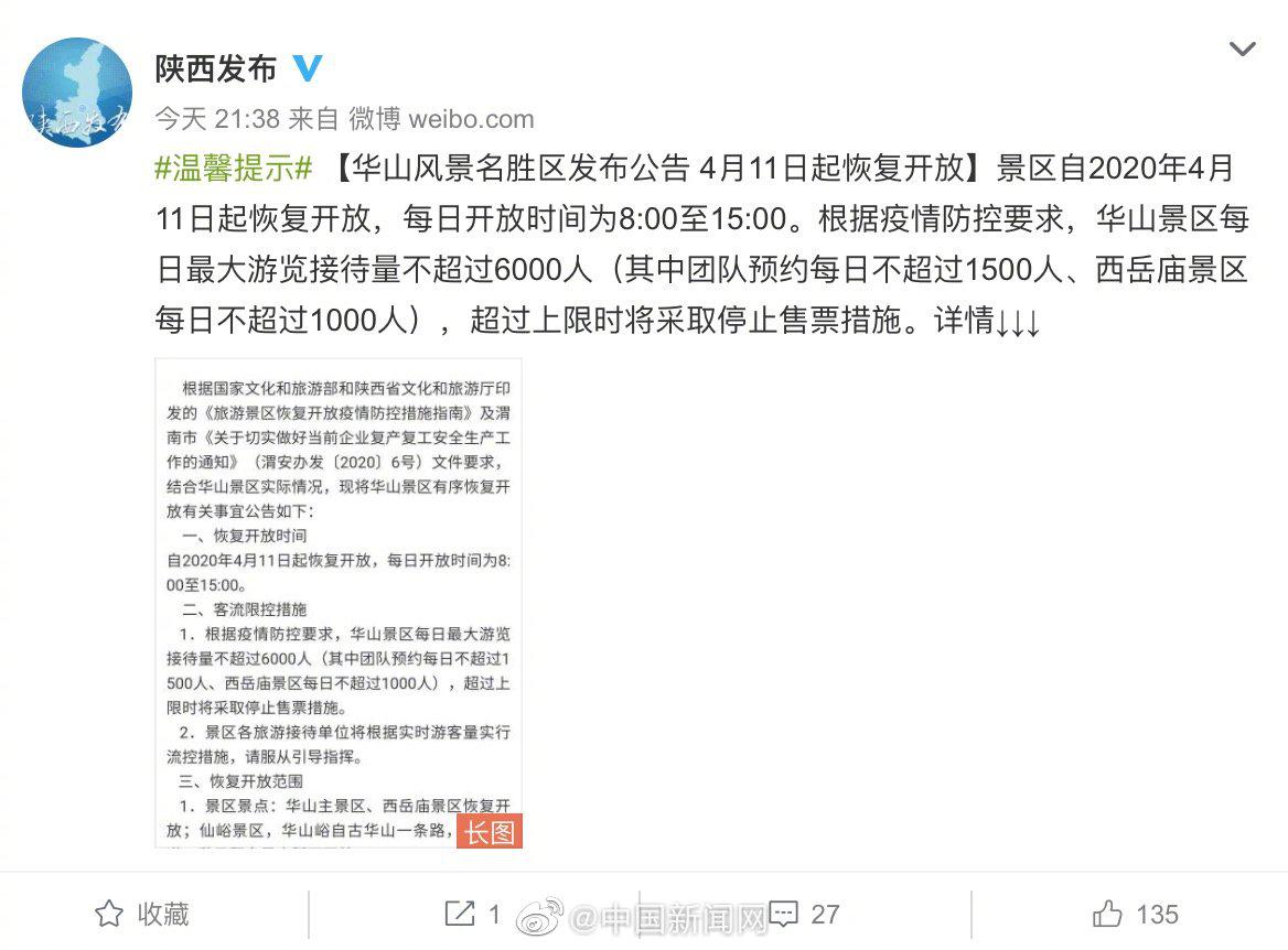 華山風(fēng)景名勝區(qū)4月9日發(fā)布公告,宣布華山風(fēng)景區(qū)4月11日起恢復(fù)開放。據(jù)@陜西發(fā)布 華山風(fēng)景名勝區(qū)發(fā)布公告稱,自2020年4月11日起恢復(fù)開放,每日開放時間為8:00至15:00。