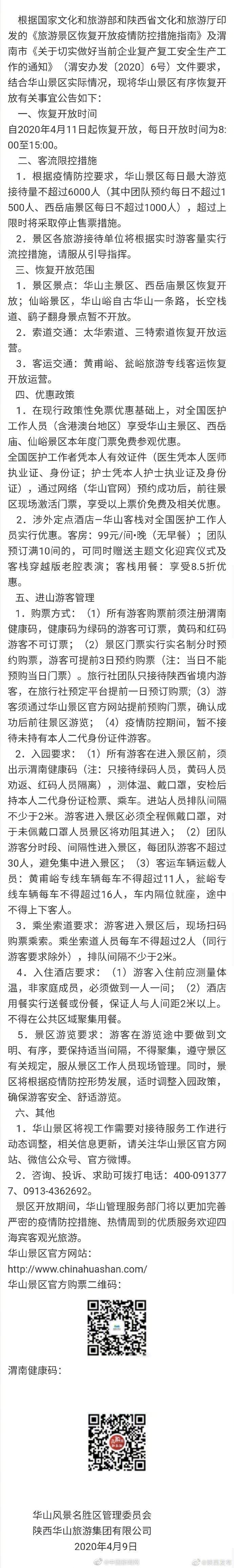 原標(biāo)題:華山風(fēng)景區(qū)11日起恢復(fù)開放 對醫(yī)護人員免門票