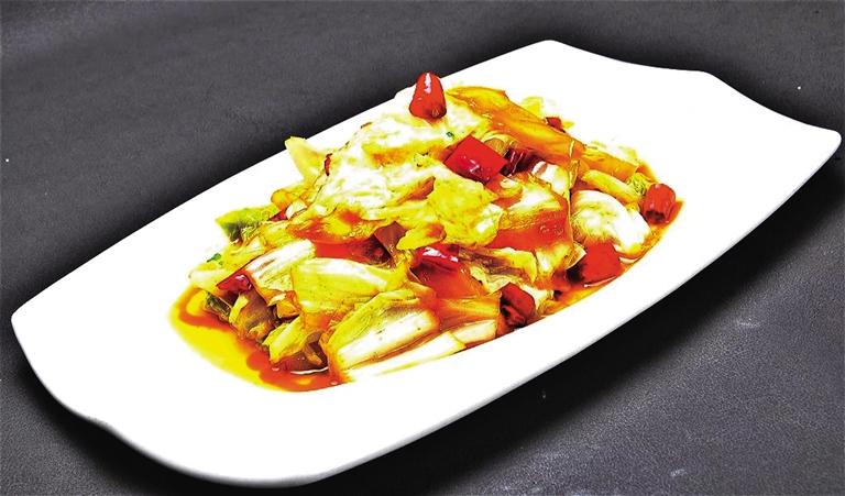 酸辣白菜的食材要選上等的大白菜,剝?nèi)ネ鈱永先~當主料。老姜去皮,優(yōu)質(zhì)紅朝天椒泡軟,川椒過熱水,以白糖、米醋、味精、香油等為輔料。先把白菜切細條,放入微量鹽,拌勻腌制四五個小時后,在涼開水中過一下,撈出控水,放至微蔫。這時,起炒鍋開火,冷油放入辣椒、花椒、蔥絲、姜絲,慢慢煎至微微發(fā)黃散出香味時,將油潑在白菜上,最后放入白糖、米醋、味精等拌勻,就大功告成了。